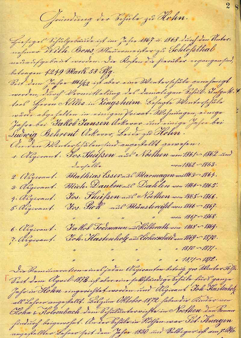 Alte Fotos aus Hohn und KolvenbachDie Chronik der ehemaligen Volksschule Hohn wurde begonnen am 2. Januar 1867 und von den jeweiligen Lehrern der Schule laufend fortgeführt. Ab dem Jahre 1954 wurden auch Fotos in die Schulchronik eingefügt, auf denen sich der eine oder andere vielleicht heute noch wiedererkennt. Die Fotos und zuvor die Seite 2 der Schulchronik, in der die Gründung der Volksschule Hohn beschrieben wird, sind angefügt.